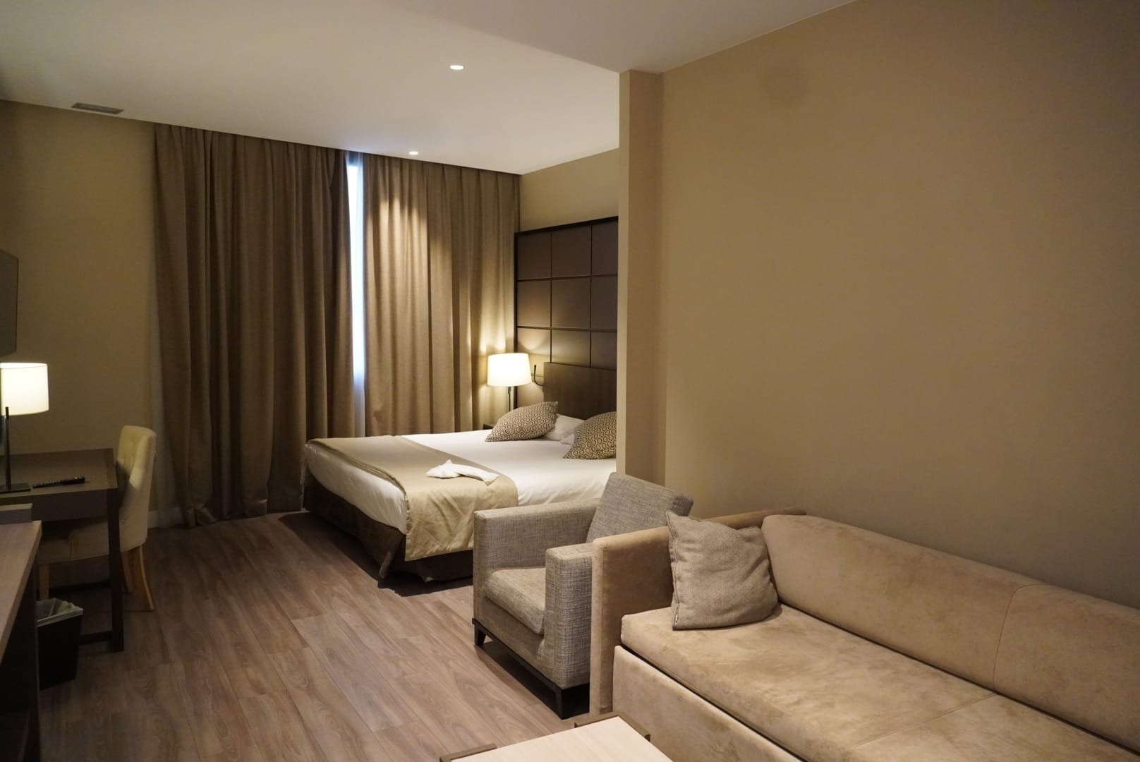 La habitación triple superior está diseñada con cortes elegantes y modernos que contrastan perfectamente con el enclave en el que se sitúa Hotel Palacio Valderrábanos. Los clientes podrán disfrutar en esta habitación de Wifi Gratis, Baño completo, Televisión, Aire acondicionado, Calefacción, Teléfono, Escritorio y sofá cama